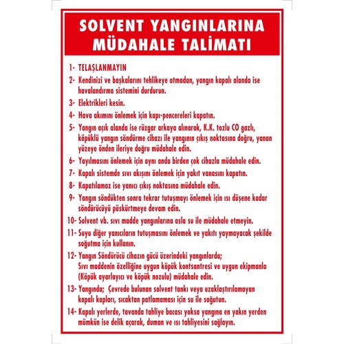 Solvent Yangınlarına Müdahale Talimatı / Uyarı - İkaz Levhası